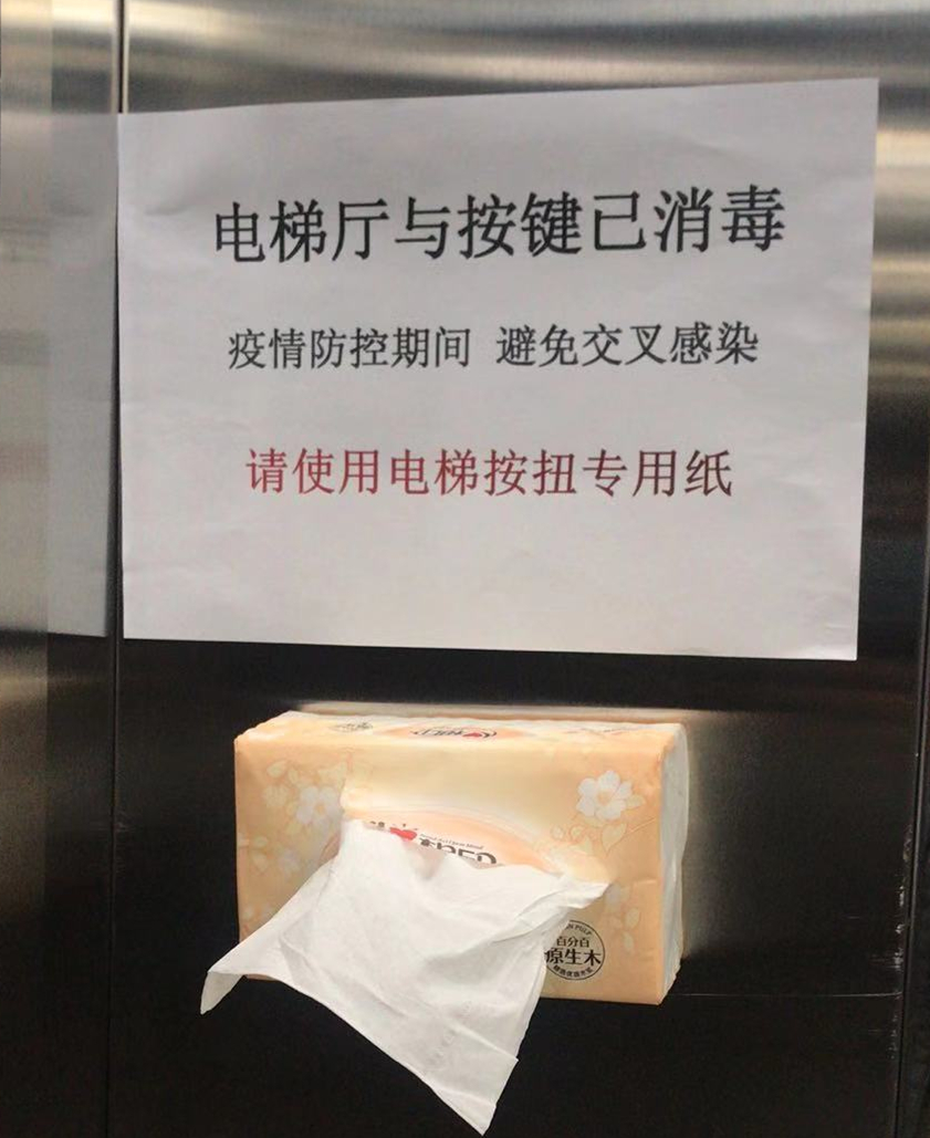 北京總部電梯間,定時消毒并提供一次性紙巾