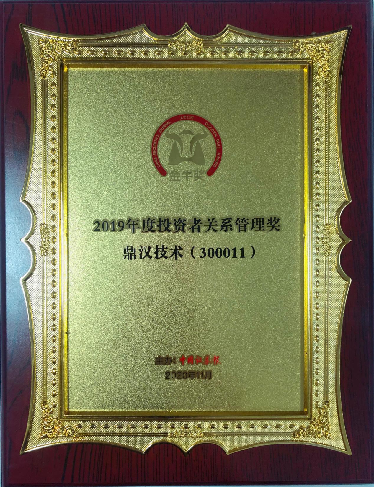 2020年11月19日,由中國證券報、??谑腥嗣裾?lián)合主辦的“2020上市公司高質(zhì)量發(fā)展論壇暨第22屆上市公司金牛獎頒獎典禮”在??谂e行。鼎漢技術(shù)榮獲2019年度金牛投資者關(guān)系管理獎。