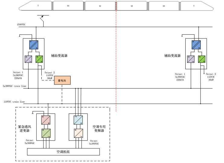 (1)輔助變流器將接觸網(wǎng)或第三軌的1500VDC的高壓直流電轉(zhuǎn)換為AC380V三相交流電,給列車上的風(fēng)扇、空調(diào)單元、空氣壓縮機(jī)等三相負(fù)載等交流負(fù)載供電;同時(shí)產(chǎn)生DC110V的直流電壓,給列車上的直流負(fù)載供電和給蓄電池充電。